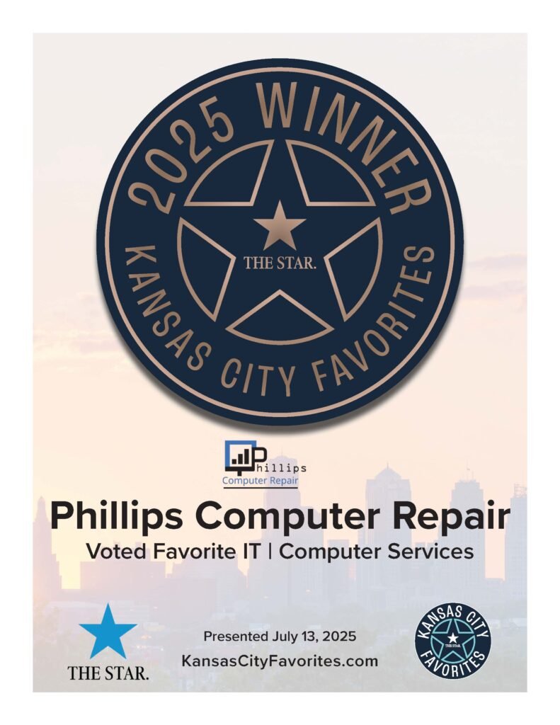 We are proud to be recognized as the 2025 Kansas City’s Favorite for IT/Computer Services. We are also proud to announce we’ve been awarded the 2025 Best Computer Repair Service in Ray County Missouri by Business Rate.